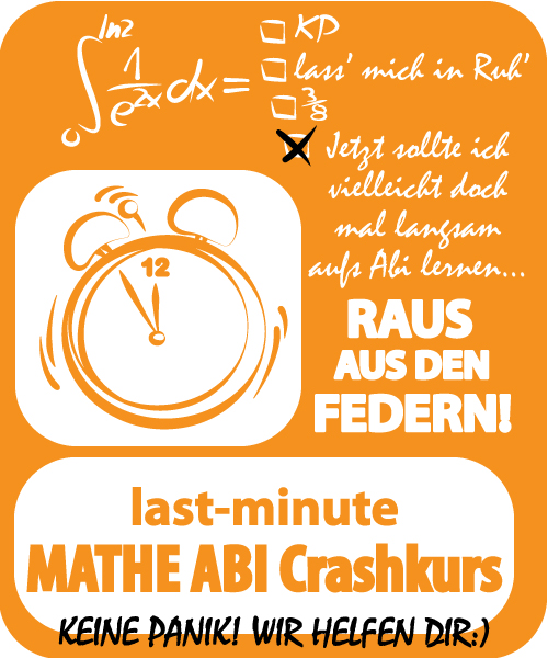 Ganz ehrlich: ein Crashkurs an sechs Tagen der alles wiederholt was du in zwei Jahren in Mathe gemacht hast alleine wird Dich nicht perfekt auf dein Mathe-Abi vorbereiten. Du musst also selbst auch aktiv werden... Mathe ist oft hauptsächlich Übung. Unser Crashkurs soll Dir helfen die besten Strategien fürs Abi zu finden, den Stoff richtig zu verstehen und jede Frage zu stellen die Du willst.